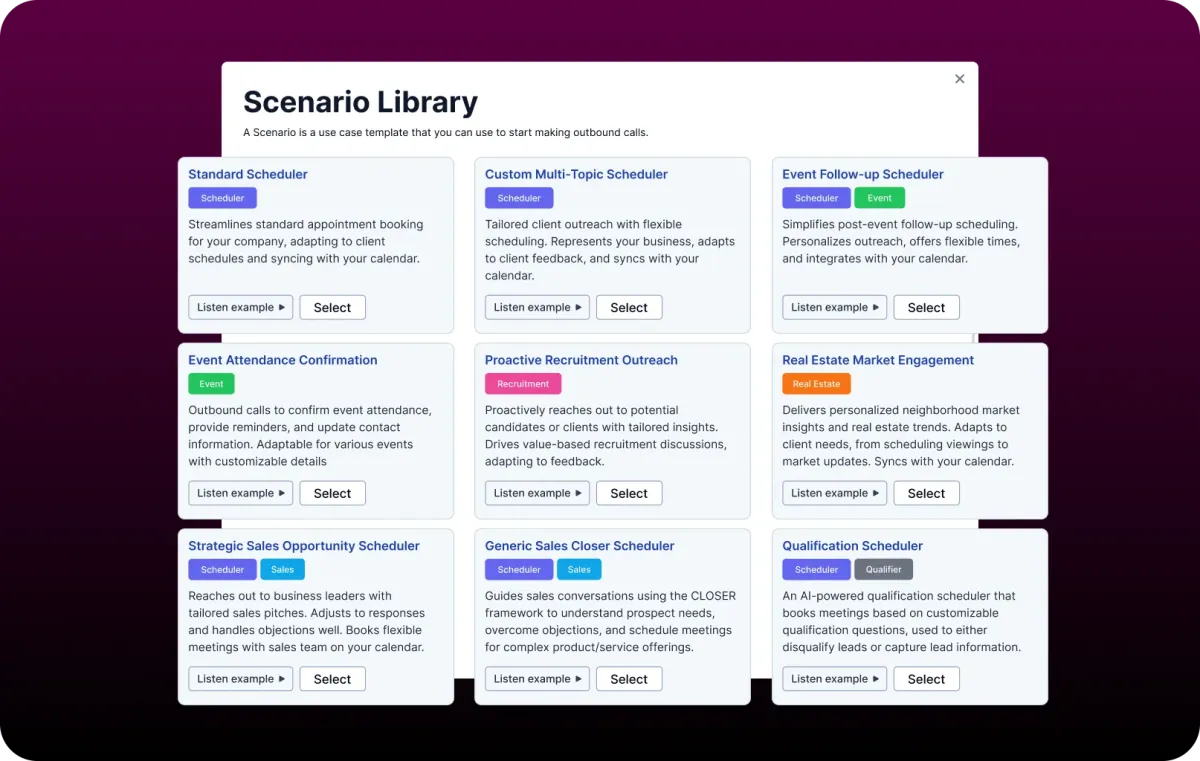 Outbound SDRs, Appointment reminder and confirmation agents, Qualification schedulers and anything else your company needs, pre-built and ready to plug into your business today.